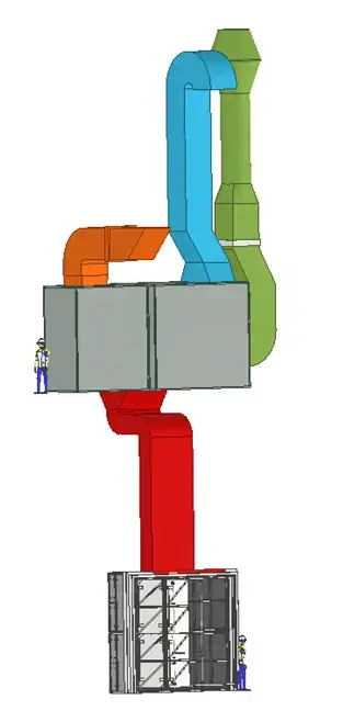 A second fan in the heating appliance draws fresh air from outside the building. This air is preheated by the heat exchanger which is heated by the extracted filtered air. This air is then passed along a burner or second heat exchanger. The heated air is then blown into the Combi hall and ensures that the correct paint processing temperature prevails in the Combi hall.