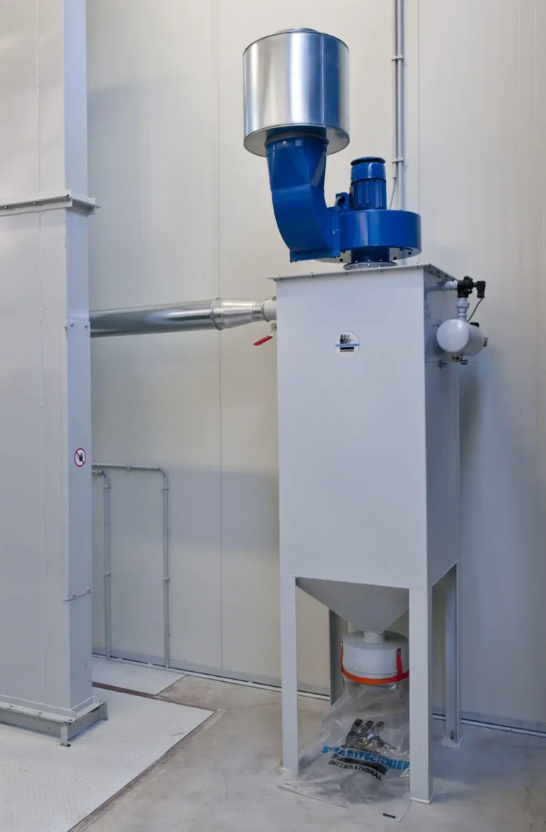 The cleaner is extracted by means of a separate extractor, in the form of a 2-cartridge continuously compressed air-cleaned cartridge filter type Pat-Jet® 2 / 13VA. This filter is preferably placed in the vicinity of the abrasive cleaner and connected to the extraction point on the cleaner by means of a fixed pipe (equipped with control valves).