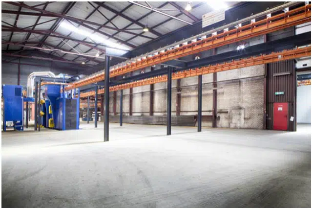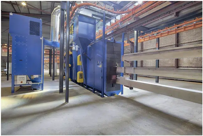 The wheel blasting machine forms a part of a fully integrated overhead conveyor transport system. This first guides steel profiles from the loading station through the wheel blasting machine and then transports them via the powder coating machine to the oven and the unloading station.