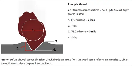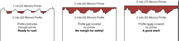 The figure above clearly shows what is involved in selecting the correct abrasive. Here you can see schematically what a so-called anchor profile is. It ensures that the paint adheres. In the case of the figure above, the primer layer thickness must in any case be greater than the roughness.