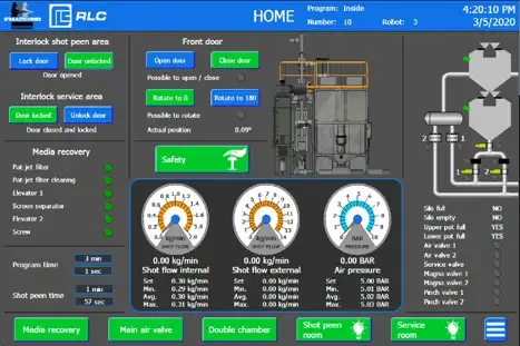 The HMI full colour touch screen control panel provides all programming features and visualisation of all set- and actual peening parameters. Different menus can be selected to enable the operator to overview the entire process data. The touch screen control panel is compact and can be either wall mounted or standing on the floor. The USB interface or direct network connection facilitates data transmission.