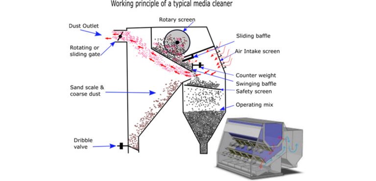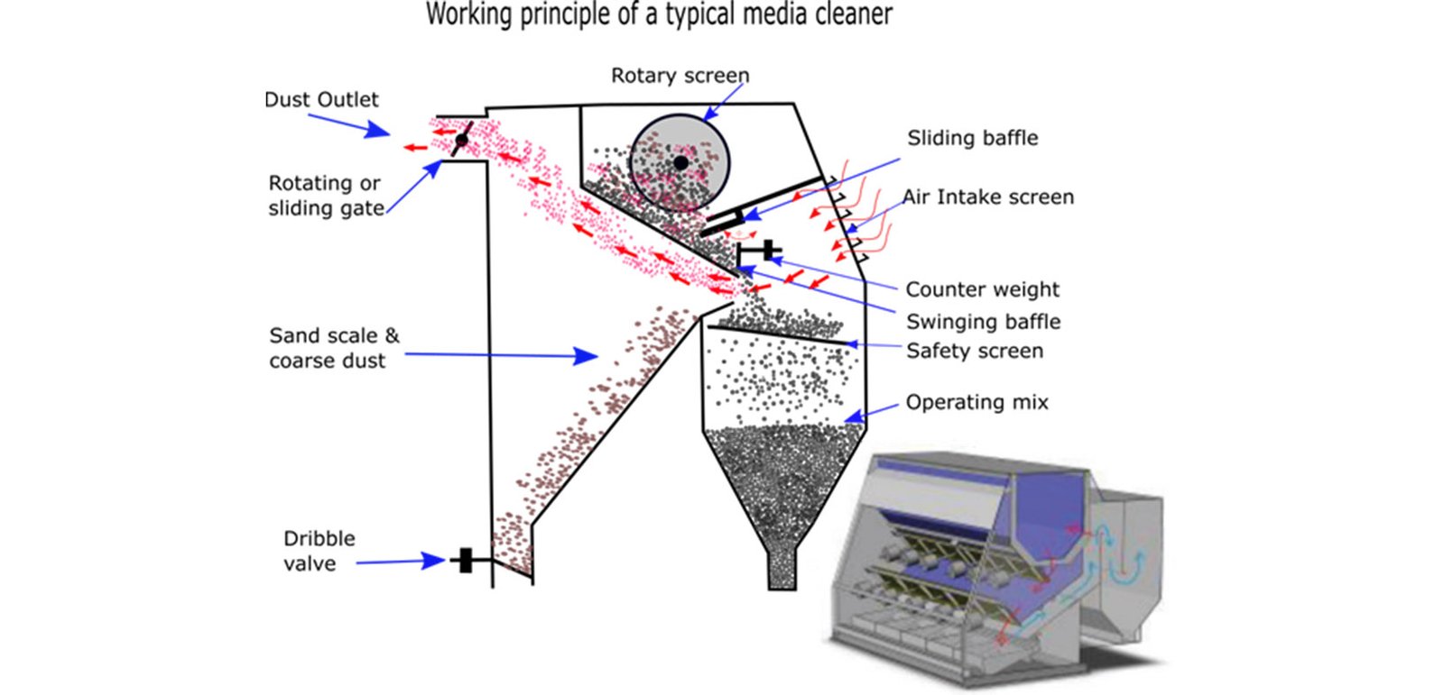 The media cleaner is connected to the elevator and mounted on the abrasive storage silo. The abrasive falls behind a pivoting valve with counterweights which distributes the abrasive media over the entire width of the cleaner. The adjustment of these counterweights ensures an optimal abrasive curtain. The connection of the suction system to the dust extractor removes the fine abrasives and dust so that the cleaned abrasive falls into the storage silo.