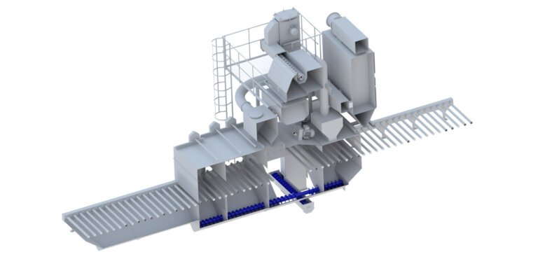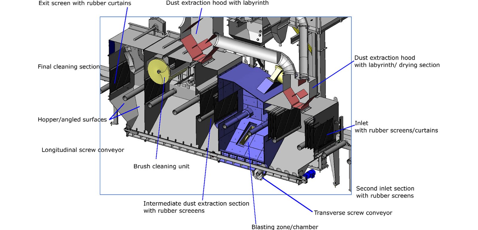 These blasting machines have inlet sections which can have additional modules such as hot / warm air blowers for dehumidification or a standard inlet through which the parts get into the machine. During the entry of the part into the machine, sensors can detect the height of the product and adjust cleaning sections according to the height of the incoming product. A complete integrated unit with hoppers, abrasive media/particle screw conveyors, bucket elevator, media cleaners, silos, valves and dust collection unit etc. work synchronously to achieve the desired blasting results on the product.
