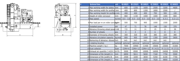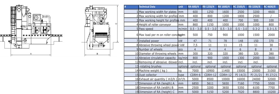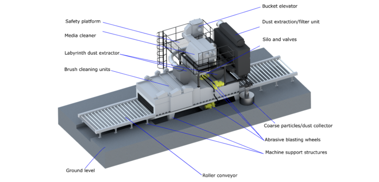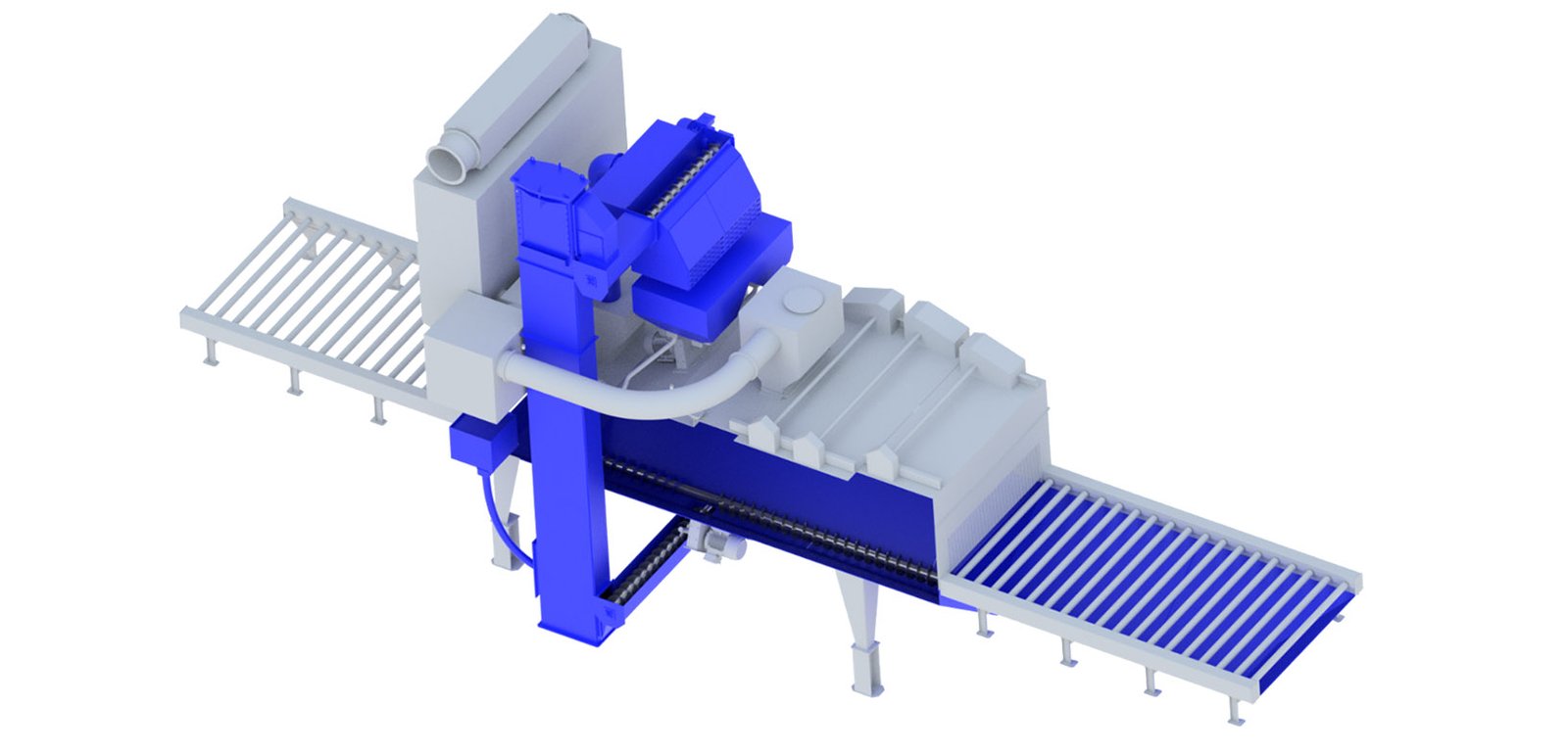 Roller conveyor type abrasive blasting machines are widely employed to blast relatively flat surfaces such as sheet metal plates, large I beams, U profiles, etc. The machine is built with several modules to achieve the desired blasting outcome.