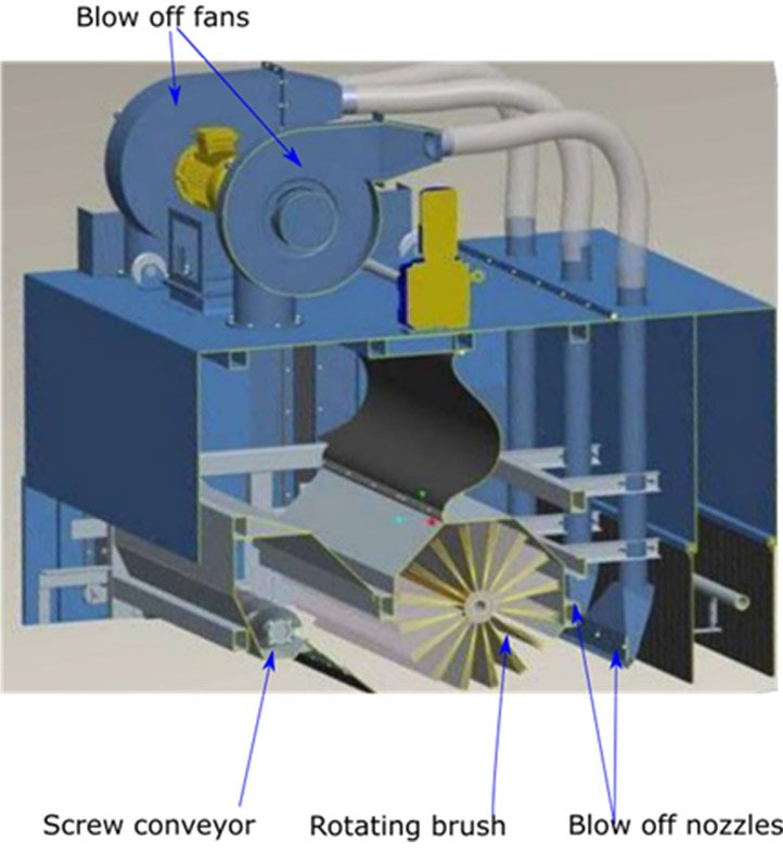 Furthermore, the system can be incorporated with specially designed roller brushes to clean the product surfaces. To achieve cleaning for products of varying heights, a height detection sensor is used. This signal is fed to the motors on the top of the cleaning chamber which automatically adjusts the height of the rolling brush units. A rolling brush unit consists a rotating brush behind which a screw conveyor is positioned. The brush due to its rotation removes the dust and abrasive blast media from the surface of the products. Due to the rotation of the brush, the media particles are thrown away from the brush. These abrasive particles are then captured in the hood / housing which also has a screw conveyor. The screw conveyor ensures that the media collected in the housing is transported to the side chutes through which the abrasives are eventually transported to the hoppers in the bottom of the machine.